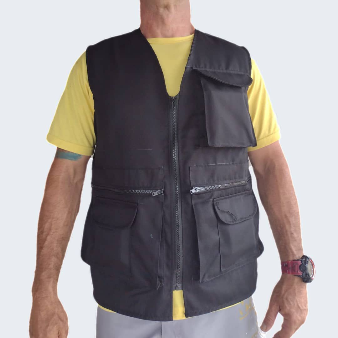 Coletes confeccionados brim leve 100% algodão, com 5 bolsos, sendo 2 com fechamento em ziperes e 3 bolsos com fechamento em lapelas.